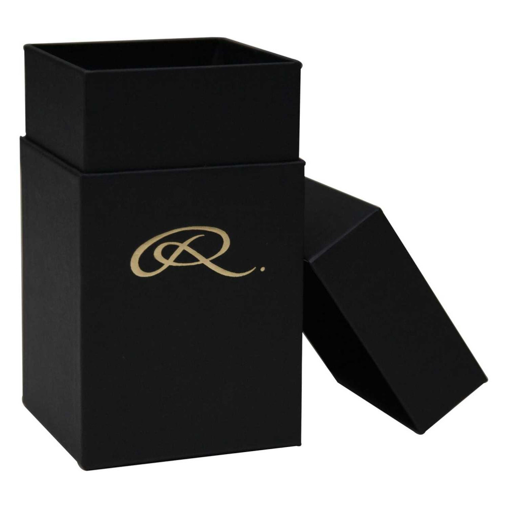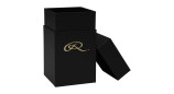 Упаковано в матово-черную коробку с твердыми стенками и красивой рельефной золотой фольгой R на боку.